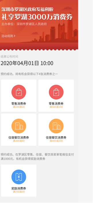3月31日,深圳羅湖區(qū)宣布,將從4月1日起向消費(fèi)者發(fā)放3000萬(wàn)元消費(fèi)券,微信掃碼即可預(yù)約申領(lǐng);此前深圳福田、龍華也宣布消費(fèi)券措施,后續(xù)也將公布具體發(fā)放政策。